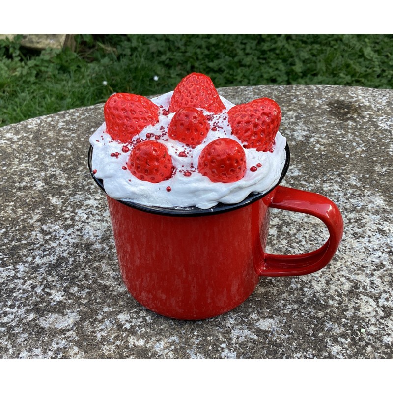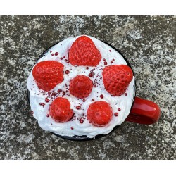 Mug métal décoratif gourmand avec fausse chantilly blanche et fraises... le tout décoré de billes rouges.