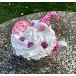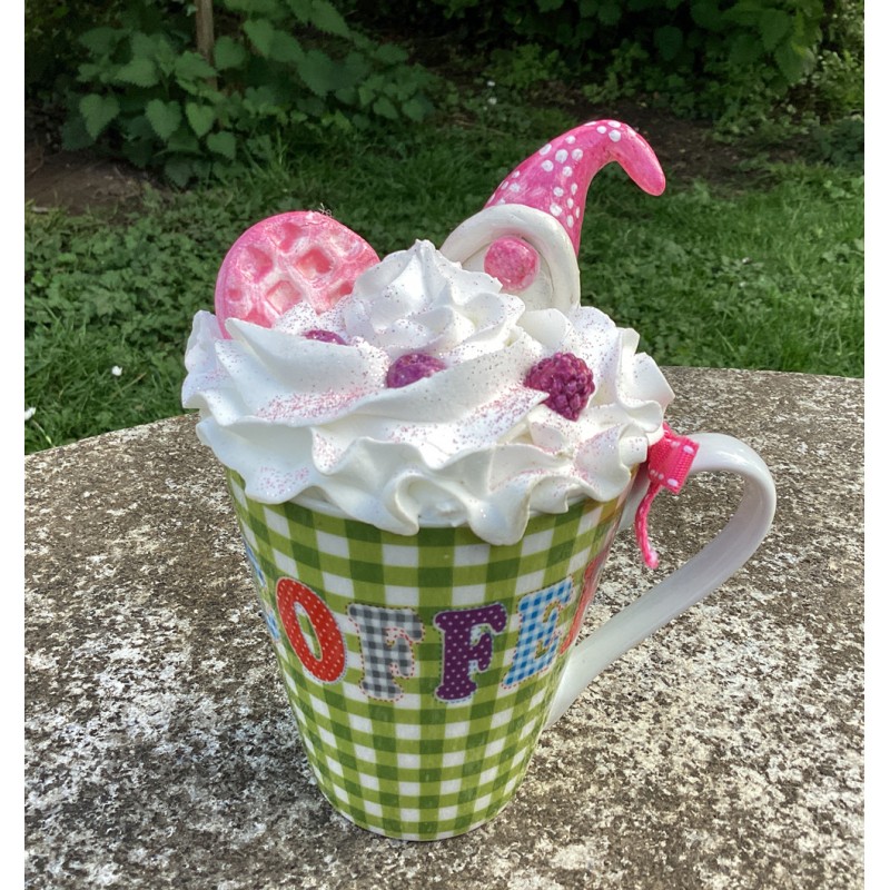 Mug décoratif gourmand avec fausse chantilly blanche et décors gnome, gaufrette et baies... le tout légèrement poudré de paillettes.