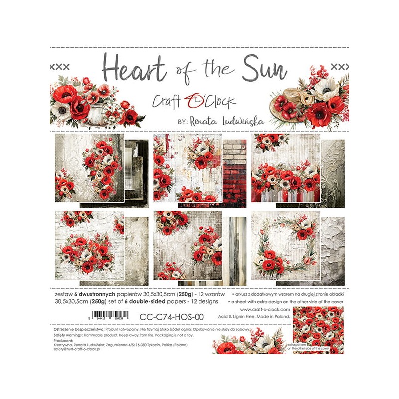 Un ensemble de 6 feuilles recto-verso (12 motifs) en papier scrapbooking de haute qualité. Chaque page mesure 30,5 x 30,5 cm (12 x 12 pouces) et comporte une bande avec le nom. De plus, chaque ensemble contient une feuille avec un motif supplémentaire au verso. La feuille pèse 250 g/m² . Ce produit est sans acide et sans lignine. Fabriqué en Pologne.