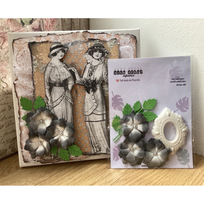 Composition : 3 découpes feuilles vertes 3 fleurs en papier textile 1 embellissement en plâtre marque : Decoscrapinfluence (sans la toile)